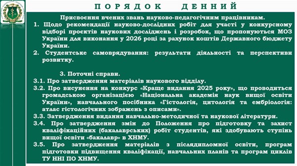 Засідання Вченої ради відбулося у конструктивній, діловій атмосфері та засвідчило послідовний розвиток ХНМУ як потужного освітнього й наукового центру, орієнтованого на якість освіти, підтримку молоді та розбудову демократичної університетської спільноти.