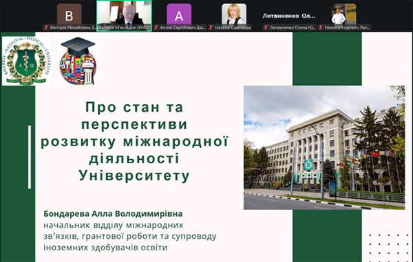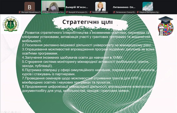 Основним питанням порядку денного було обговорення стану та перспектив розвитку міжнародної діяльності університету. З доповіддю виступила начальниця відділу міжнародних зв’язків, грантової роботи та супроводу іноземних здобувачів освіти Алла Бондарева, детально представивши структуру відділу та ключові напрями його діяльності. Вона висвітлила питання комунікаційної роботи, організації інформаційних заходів і семінарів, розвитку академічної мобільності, а також популяризації міжнародної діяльності ХНМУ. Окрему увагу доповідачка приділила розширенню міжнародного партнерства, участі університету в освітніх, наукових і грантових проєктах та стратегічним цілям інтернаціоналізації.