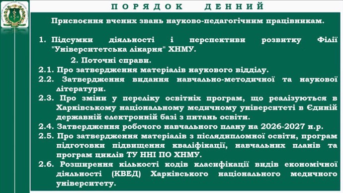 26 березня 2026 року в дистанційному форматі відбулося засідання Вченої ради Харківського національного медичного університету.