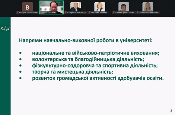 У ході засідання було розглянуто ключові питання навчально-виховної роботи, її здобутки та подальші завдання. З основною доповіддю виступив помічник ректора Олексій Троценко, який представив комплексний огляд напрямів навчально-виховної діяльності університету. Серед них: національно-патріотичне та військово-патріотичне виховання, волонтерська й благодійницька діяльність, фізкультурно-оздоровчий і спортивний розвиток, творча та мистецька активність, а також формування громадянської позиції здобувачів освіти.