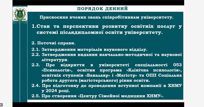 25 квітня 2024 р. відбулося засідання Вченої ради Харківського національного медичного університету в дистанційному форматі.