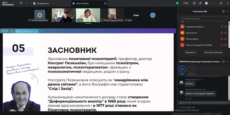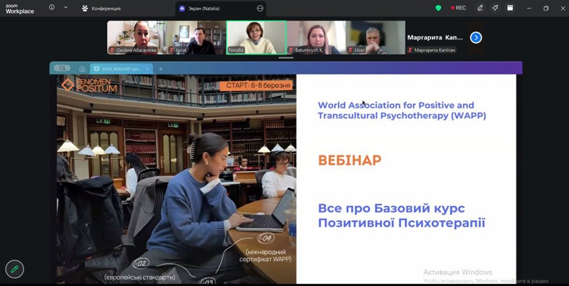 Під час вебінару учасники ознайомилися з одним із сучасних і затребуваних напрямів психотерапії – Позитивною психотерапією (ППТ). Було розкрито особливості методу, його можливості у практичній роботі психолога, а також переваги використання в різних сферах психологічної допомоги.