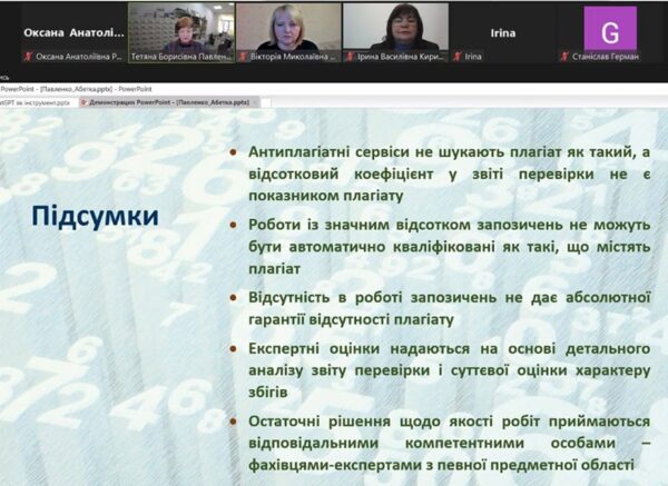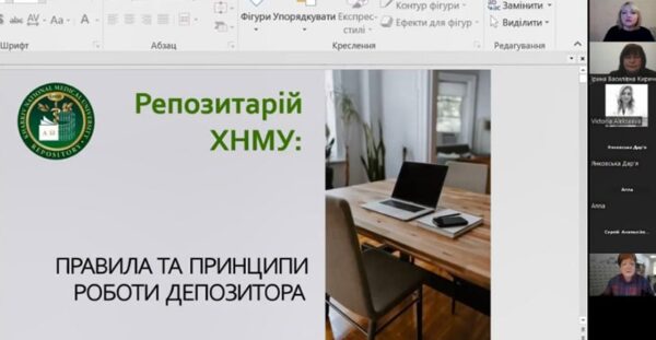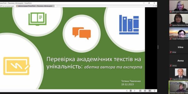 Спікерки – головна бібліотекарка Вікторія Борзенкова та заступниця директора бібліотеки Тетяна Павленко – розповіли про зв’язок принципів академічної доброчесності з роботою щодо наповнення репозитарію, алгоритм роботи депозитора та його взаємодію з адміністратором Репозитарію ХНМУ, а також про порядок перевірки текстів на унікальність, які інструменти застосовуються, результати перевірки та допустимі показники, використання штучного інтелекту при написанні текстів тощо.