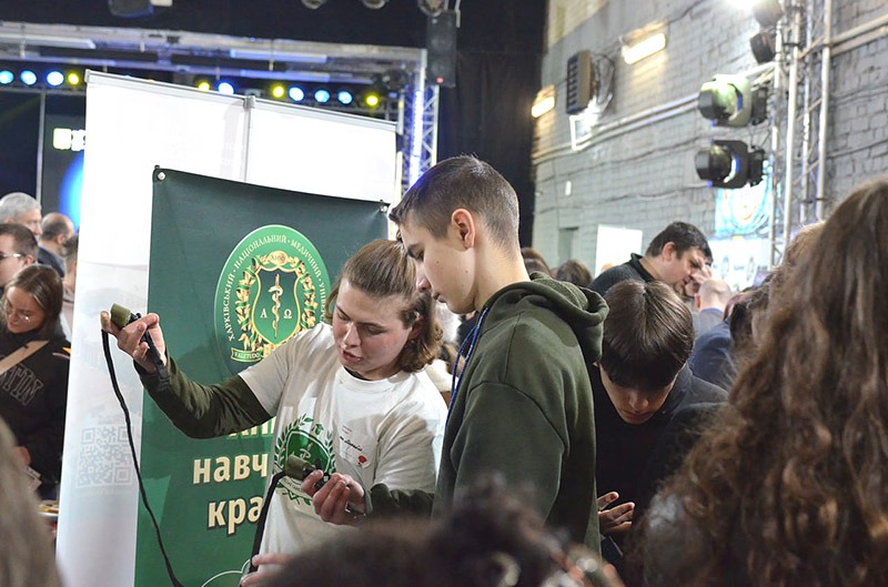 На заході також були присутні ректор ХНМУ Валерій М’ясоєдов та інші представники університету. Також наш виш долучився до профорієнтаційної виставки, де представники медичного ЗВО розповіли про вступ, діяльність університету, а також продемонстрували та надали можливість відпрацювати практичні навички з надання домедичної допомоги на фантомах. Серед них оцінка стану постраждалого, виконання зовнішнього масажу серця і штучне дихання, забезпечення дихання потерпілого у відповідній позі, зупинка кровотечі, правила накладання турнікета. Крім того, була продемонстрована техніка виконання внутрішньовенних і внутрішньомʼязових ін’єкцій та тампонування ран.