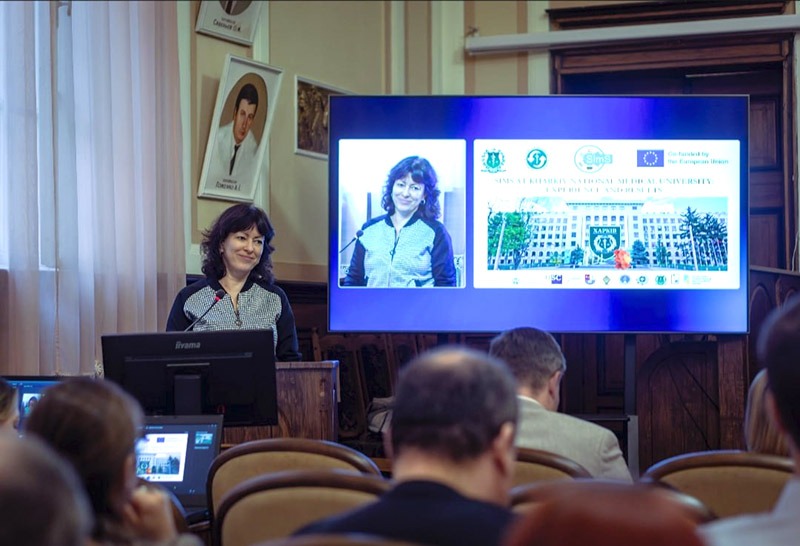 Директорка Симуляційного центру ННІ ЯО ХНМУ Тетяна Меркулова представила доповідь про основні результати участі університету в проєкті та здобутки у впровадженні інноваційних підходів до підготовки майбутніх лікарів і фахівців категорії «перший на місці події».