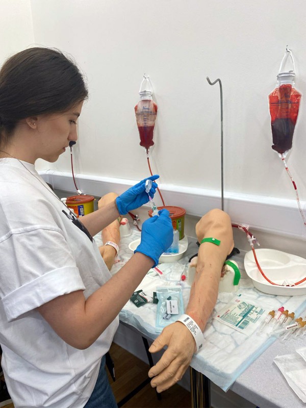 Перший тиждень почався з того, що ми у нас були заняття з базових клінічних навичок: правила асептики й антисептики, в’язання хірургічних вузлів та накладання швів, забір крові, встановлення периферичних катетерів та тренінг із реанімаційних заходів. Також досить цікавим досвідом було заняття з акторкою, яка грала роль пацієнтки. Там ми змогли потренуватися спілкуватися та збирати анамнез. Мені дуже сподобалося, що нас постійно опитували про різні стани, з якими ми стикалися під час обходів або медичних маніпуляцій, а також розповідали додаткову інформацію та де її можна прочитати.