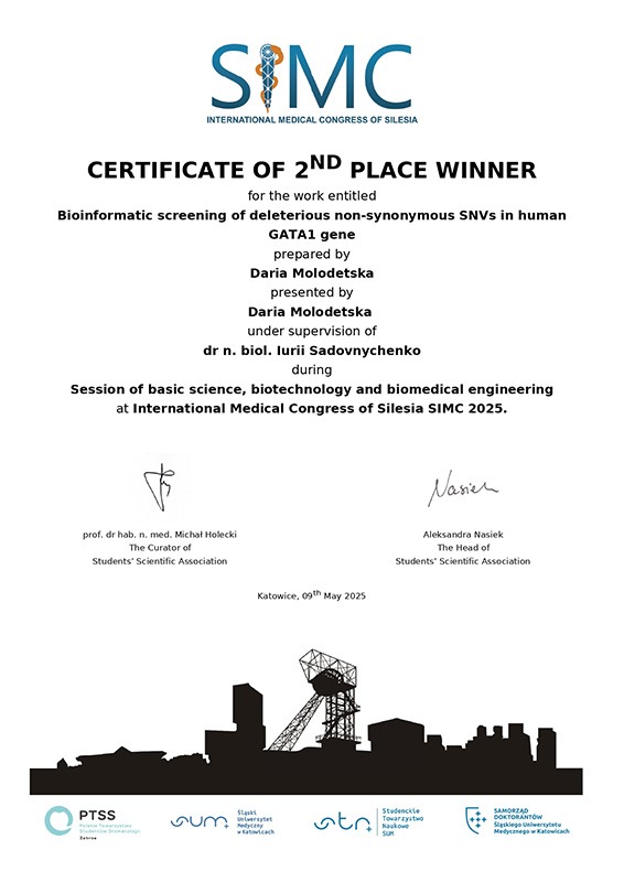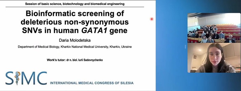 Харківський національний медичний університет на конгресі SIMC 2025 представляла студентка І курсу І медичного факультету Дарія Молодецька, яка на сесії фундаментальних наук, біотехнології та біомедичної інженерії зробила доповідь за темою «Bioinformatic screening of deleterious non-synonymous SNVs in human GATA1 gene» (науковий керівник – директор ННІ ЯО, доцент кафедри медичної біології Юрій Садовниченко). Учасники конференції були вражені не лише науковими здобутками Дарії та її фундаментальними знаннями у галузі молекулярної медицини, а й її юним віком. За результатами роботи сесії робота Дарії була відзначена дипломом ІІ ступеня.