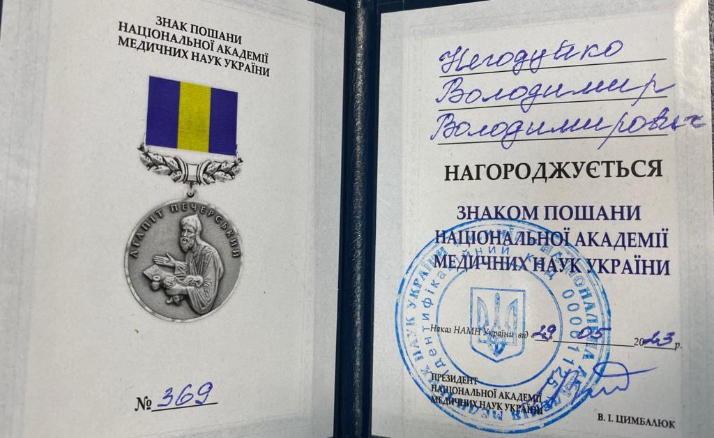 Знаком пошани Національної академії медичних наук України нагороджено доцента кафедри хірургії № 4, начальника клініки невідкладної допомоги (прийому та евакуації) Військово-медичного клінічного центру Південного регіону Володимира Негодуйка за надання допомоги пораненим військовослужбовцям та цивільним.