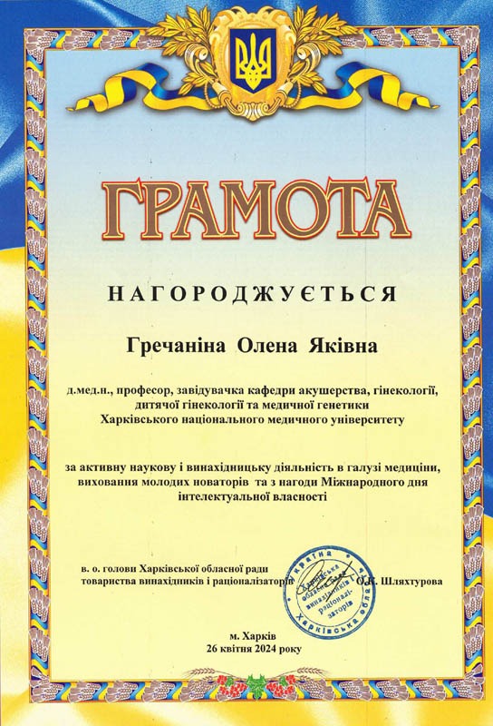 Грамотою від в.о. голови Харківської обласної ради товариства винахідників та раціоналізаторів О.К. Шляхтурової була нагороджена завідувачка кафедри акушерства, гінекології, дитячої гінекології та медичної генетики професорка Олена Гречаніна.