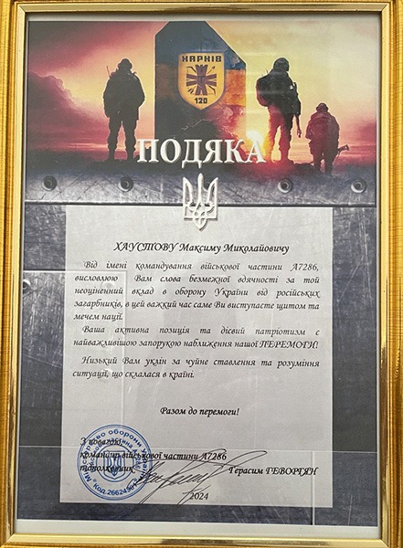 Також Максиму Хаустову була вручена подяка від командира військової частини А7286 підполковника Герасима Геворгяна. Командування військової частини висловлює вдячність за неоціненний вклад в оборону України від російських загарбників, чуйне ставлення та розуміння ситуації, що склалася в країні. Активна позиція та дієвий патріотизм пана Максима є найважливішою запорукою наближення нашої Перемоги.