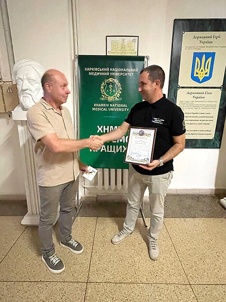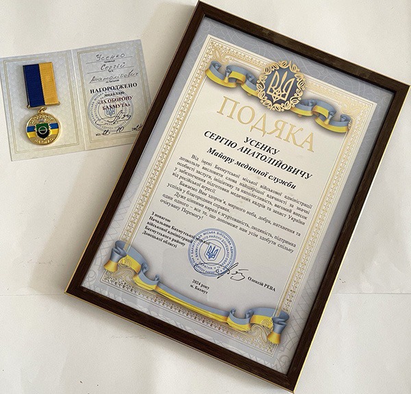 Від начальника Бахмутської воєнної адміністрації Олексія Реви за значні особисті заслуги, ініціативу та наполегливість, вагомий внесок у забезпечення підготовки медичних кадрів та захист України від російської агресії Подяку вручили професору кафедри гігієни, епідеміології, дезінфектології та професійних хвороб Сергію Усенку. Також пан Сергій був нагороджений медаллю «За оборону Бахмута».