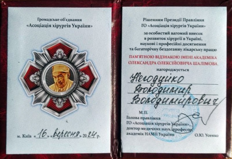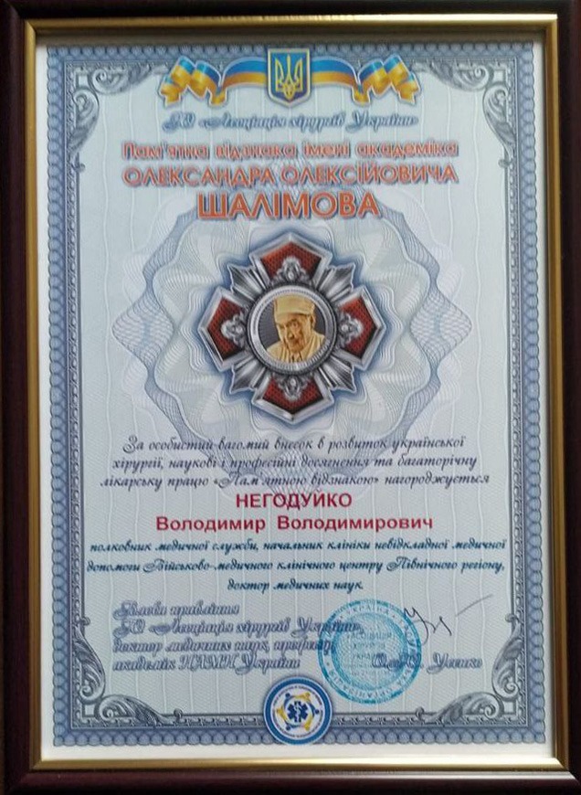 Асоціація хірургів України нагородила професора кафедри хірургії № 4, полковника медичної служби, начальника клініки невідкладної медичної допомоги ВМКЦПР Володимира Негодуйка Пам’ятною відзнакою імені академіка О.О. Шалімова за надання медичної допомоги пораненим військовим та цивільним.