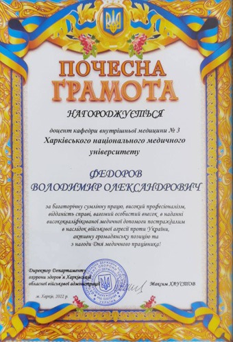 Директор Департаменту охорони здоров’я Харківської обласної адміністрації Максим Хаустов нагородив Почесною грамотою доцента кафедри внутрішньої медицини № 3 Володимира Федорова за багаторічну сумлінну працю, високий професіоналізм, відданість справі, вагомий особистий внесок в наданні висококваліфікованої медичної допомоги постраждалим в наслідок військової агресії проти України, активну громадянську позицію та з нагоди Дня медичного працівника.
