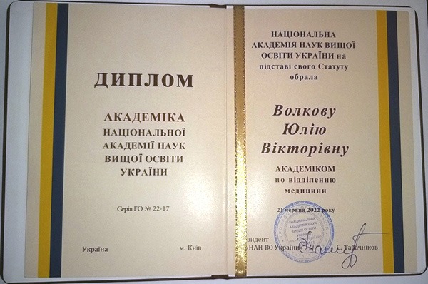 Національна академія наук вищої освіти України на підставі свого статуту обрала Юлію Волкову академіком по відділенню медицини.