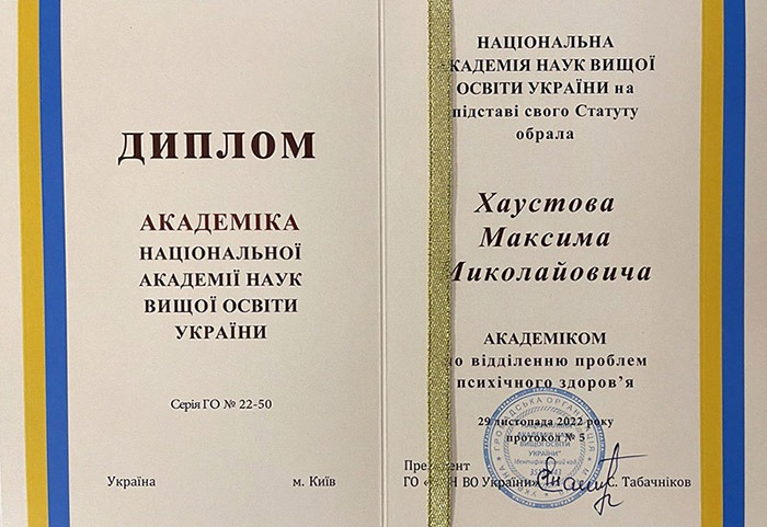 Національна академія наук вищої освіти України на підставі свого статуту обрала Максима Хаустова академіком по відділенню проблем з психічного здоров’я.
