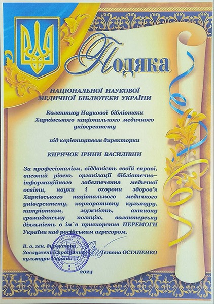 Колектив Наукової бібліотеки Харківського національного медичного університету на чолі з директором Іриною Киричок отримав Подяку від головної медичної бібліотеки країни – Національної наукової медичної бібліотеки України.