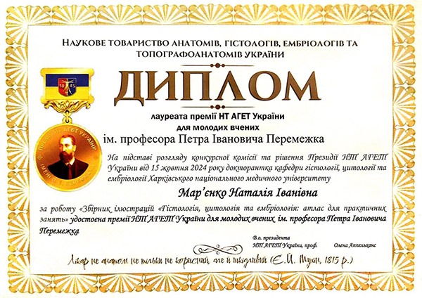 Докторант кафедри гістології, цитології та ембріології Наталія Мар’єнко стала лауреатом премії Наукового товариства анатомів, гістологів, ембріологів та топографоанатомів України для молодих учених ім. професора Петра Перемежка. Премія присуджується молодим ученим за роботу в напрямку гістології, цитології та ембріології.