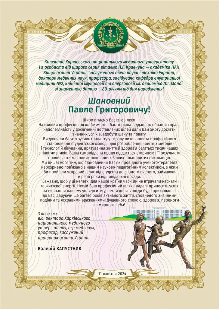 11 жовтня свій 80-річний ювілей відзначає академік НАН Вищої освіти України, заслужений діяч науки і техніки України, завідувач кафедри внутрішньої медицини № 2, клінічної імунології та алергології ім. академіка Л.Т. Малої Павло Григорович Кравчун.