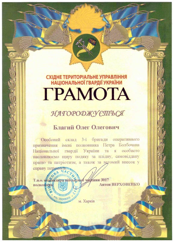 Грамотою Східного територіального управління Національної гвардії України нагороджено студента IV медичного факультету (спеціальність «Фізична терапія та ерготерапія») Олега Благого.