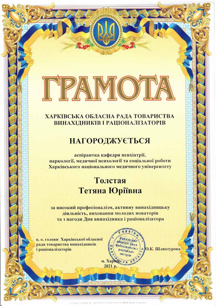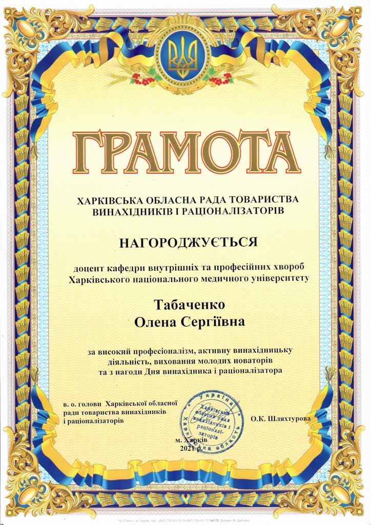 За активну винахідницьку та наукову діяльність в галузі медицини та з нагоди Міжнародного дня інтелектуальної власності грамотами нагороджено доцентку кафедри внутрішніх та професійних хвороб Олену Табаченко та аспірантку кафедри психіатрії, наркології, медичної психології та соціальної роботи Тетяну Толстую.