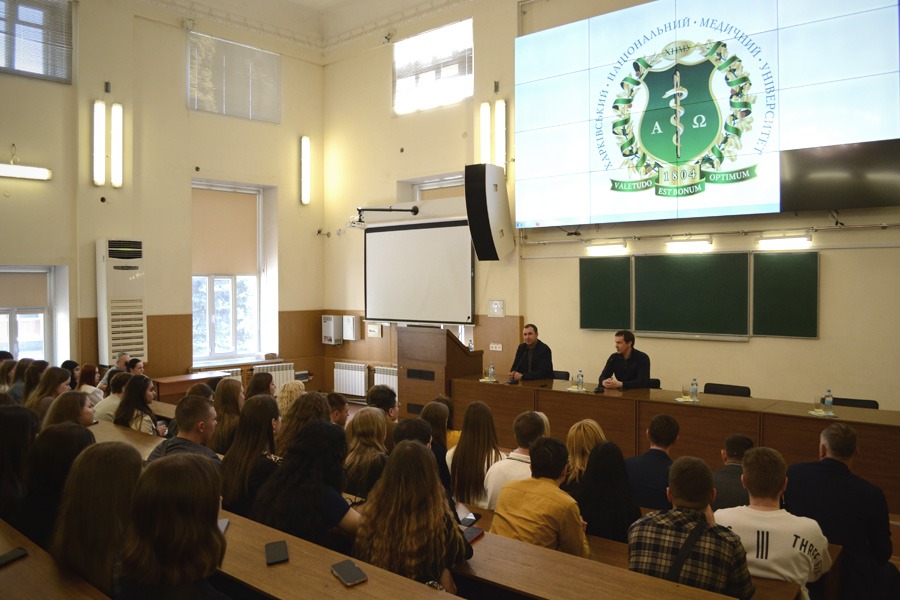 Сергій Убогов також поспілкувався з професорсько-викладацьким складом та студентами. «Мені дуже приємно вперше побувати в стінах Харківського національного медичного університету. Вражає те, як ви змогли зберегти спадщину та надбання, починаючи з 1805-го, зважаючи на те, які видатні постаті тут працювали, і при цьому ви постійно рухались вперед, впроваджуючи новітні технології», – зазначив пан Сергій. Він висловив надію на те, що війна якомога скоріше закінчиться і студенти повернуться до авдиторій, хоча деякі засоби навчання онлайн настільки гарно себе проявили, що їх можна залишити.