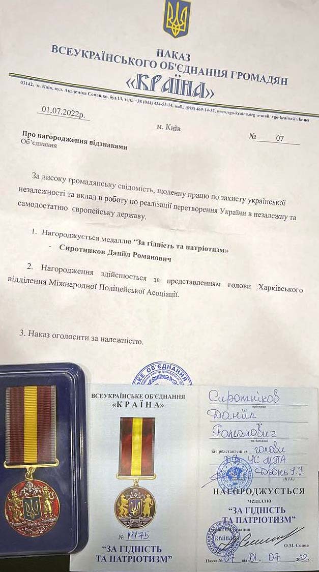 За свою діяльність Даніїл Сиротніков був нагороджений медалями «За гідність та патріотизм», «За волонтерську діяльність» та «За вірність українському народу» від голови Харківського відділення Міжнародної поліцейської асоціації, з якою співпрацює понад 5 років.