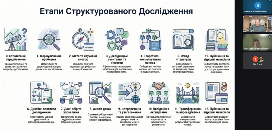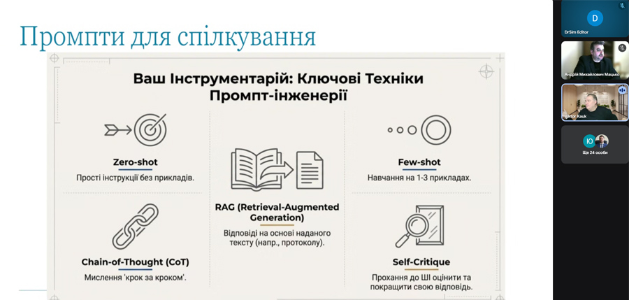 Упродовж курсу учасники опрацювали підходи до роботи з чат-асистентами та промптами, інструментами для пошуку, аналізу й систематизації інформації, створення навчального контенту (презентацій, зображень, інфографіки, відео), генерації голосу та звуків, а також використання ШІ в роботі з науковими статтями. За підсумками навчання слухачі отримали практичні шаблони та приклади застосування інструментів, які можуть бути використані при підготовці занять, комунікації зі студентами та розвитку наукових ініціатив.