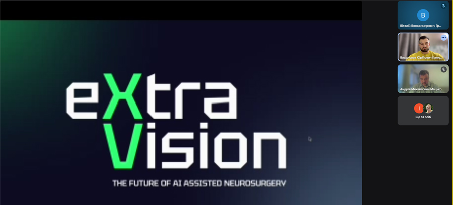 На заключному занятті асистент кафедри неврології з курсом нейрохірургії ХНМУ Владислав Калюжка презентував стартап-проєкт ExtraVision, який за допомогою технологій штучного інтелекту (AI) та доповненої реальності (AR) перетворює КТ- та МРТ-знімки на 3D-моделі органів пацієнта й допомагає спланувати та симулювати операцію на головному або спинному мозку.