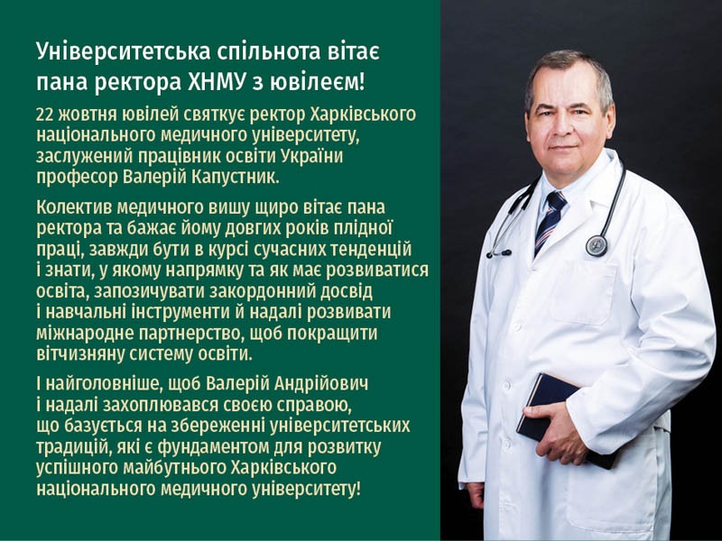 Багато теплих слів лунає на адресу ректора Харківського національного медичного університету професора Валерія Капустника в день його ювілею, який він відзначає 22 жовтня. Талановитими керівниками не народжуються, ними стають через набутий досвід, високий інтелектуальний потенціал, чутливість і розуміння людей, а саме їх прагнень, амбіцій та можливість реалізації їхніх планів та задумів.
