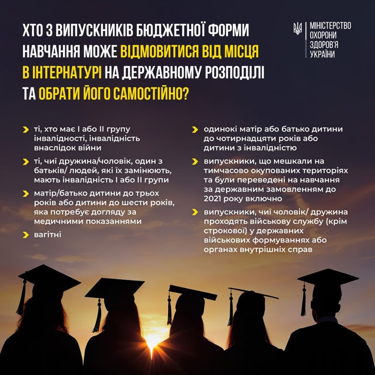 Випускники бюджетної форми навчання можуть відмовитися від місця в інтернатурі на державному розподілі та обрати його самостійно. Деталі можна побачити на інфографіці, а також на сайті Міністерства охорони здоров’я України.