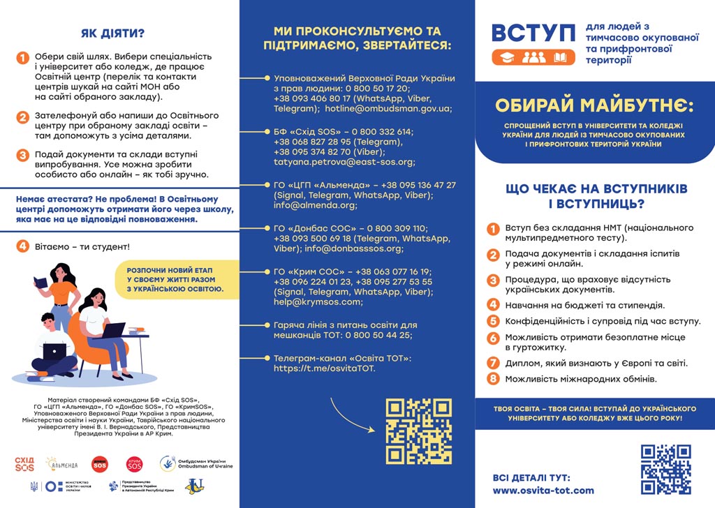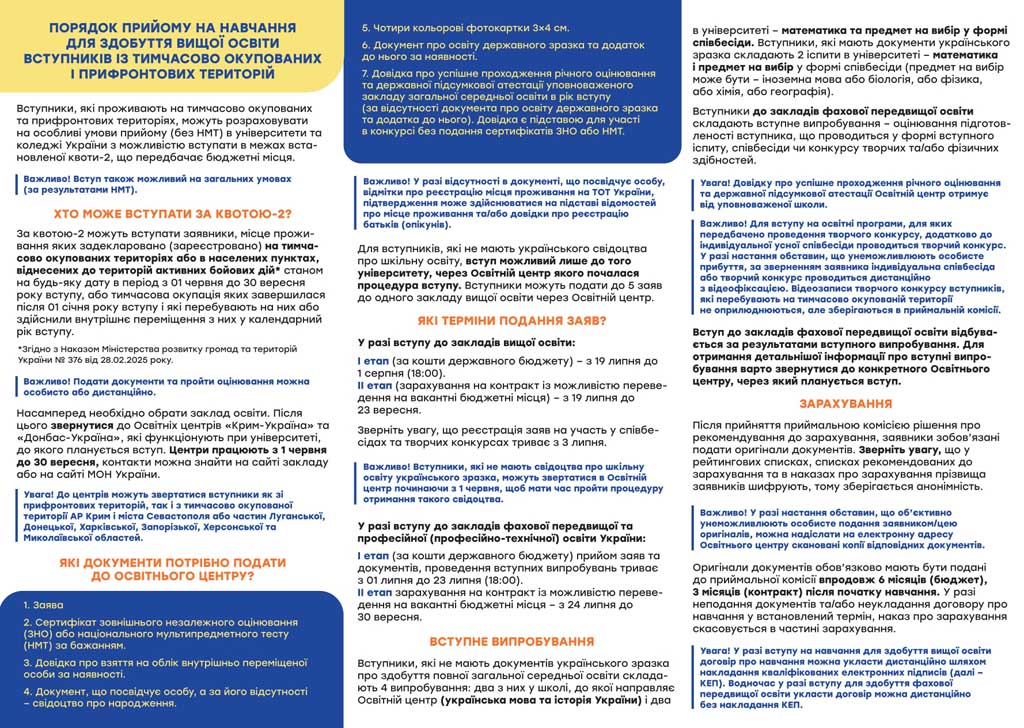 Інформацію щодо роботи освітніх центрів «Донбас-Україна» та «Крим-Україна» Харківського національного медичного університету та медичного фахового коледжу ХНМУ можна знайти у Положенні про роботу освітніх центрів «Крим-Україна», «Донбас-Україна» у Харківському національному медичному університеті та Медичному фаховому коледжі Харківського національного медичного університету, Правилах прийому на навчання для здобуття вищої освіти у Харківському національному медичному університеті осіб, які проживають на тимчасово окупованій російською федерацією території України.