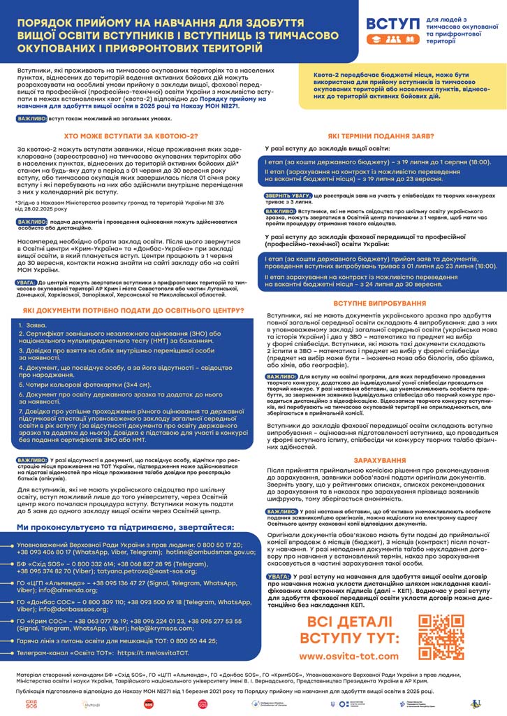- У разі відсутності в документі, що посвідчує особу, відмітки про реєстрацію місця проживання на територіях, де неможливо забезпечити виконання стандартів освіти України та/або стабільний освітній процес, підтвердження факту проживання може здійснюватися на підставі відомостей, зазначених у документах, визначених в абзаці третьому частини сьомої статті 4 Закону України «Про забезпечення прав і свобод внутрішньо переміщених осіб», копіях документів, до яких вносяться відомості про місце проживання та/або довідки про реєстрацію місця проживання батьків (одного з батьків), в яких зазначено місце проживання на відповідних територіях;