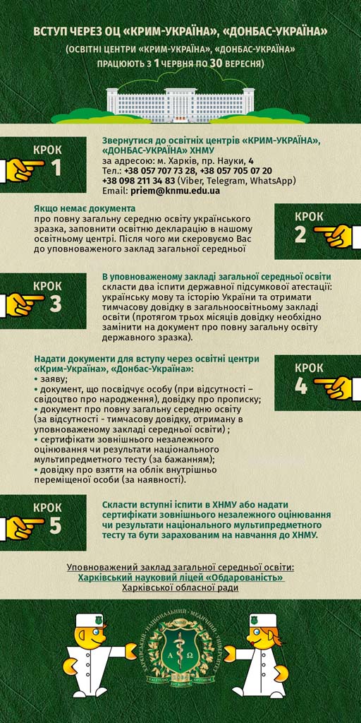 Керівник освітніх центрів «Донбас-Україна» та «Крим-Україна» Харківського національного медичного університету: заступник відповідального секретаря Приймальної комісії, доцент Бугайова Олена Валеріївна (+38 098 211 34 83 (Viber, WhatsApp)).