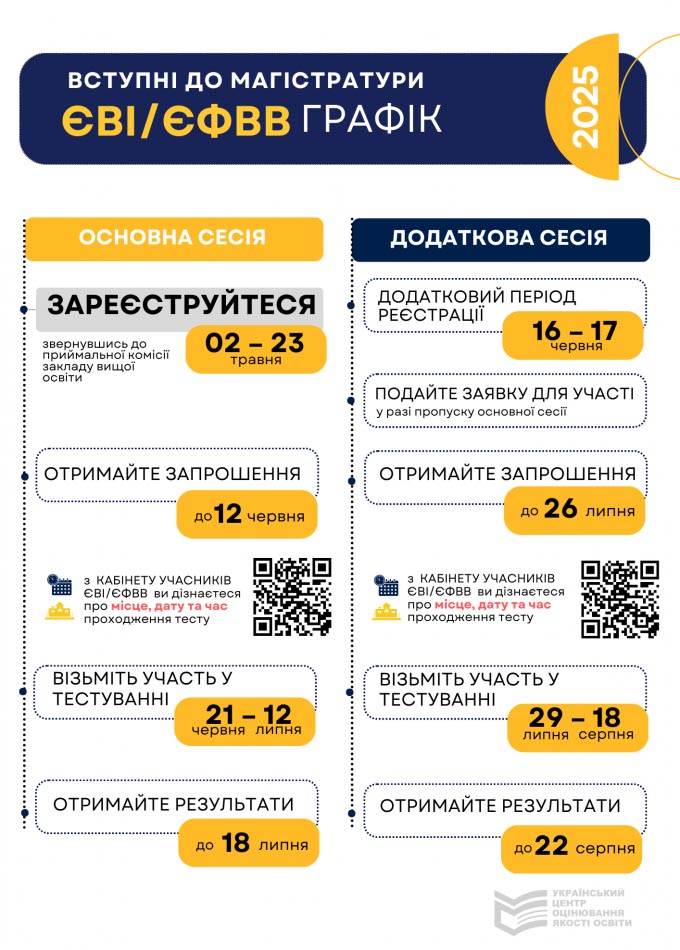 Відповідно до Календарного плану організації та проведення у 2025 році вступних випробувань до магістратури, затвердженого наказом Міністерства освіти і науки України від 12.02.2025 № 201, вступні випробування проходитимуть у дві сесії: